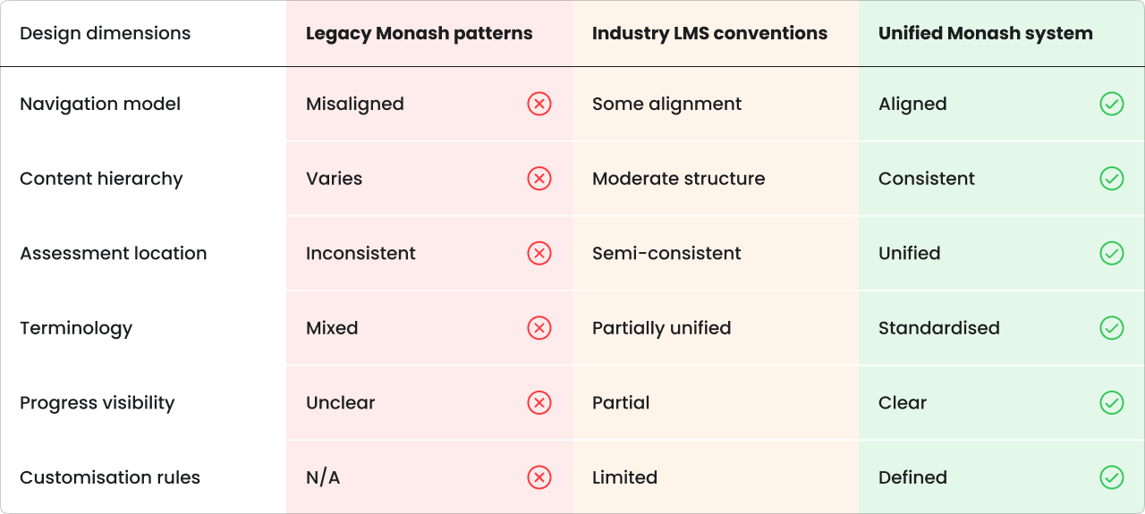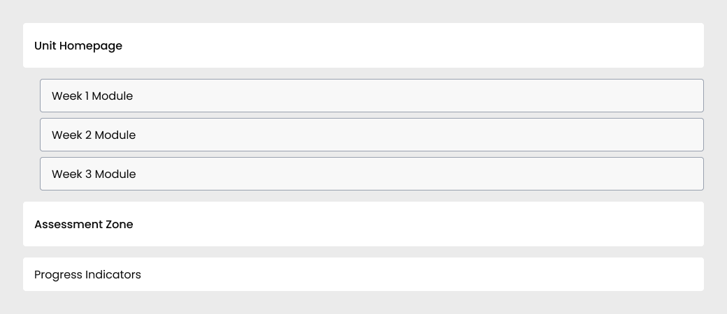Students moving between units encountered different patterns for finding learning materials and assessments. Teaching staff rebuilt structures manually, with no shared baseline to guide consistency.