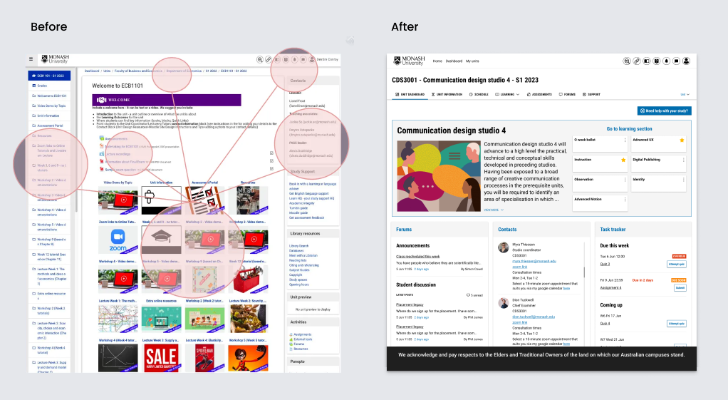 Monash University’s Moodle environment had evolved independently across faculties, resulting in inconsistent structures, duplicated effort, and uneven student experiences. As part of the Digital Learning Uplift programme, this work established a shared, scalable system for how learning is structured and experienced across the platform.