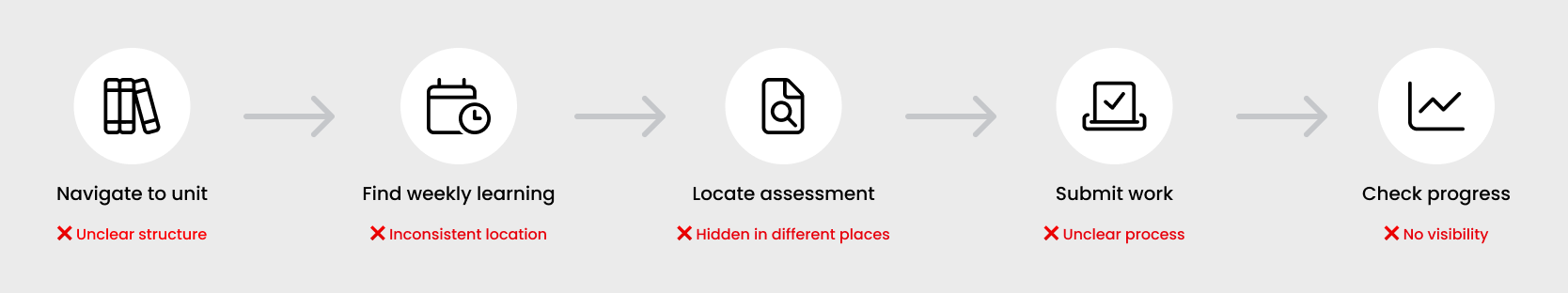 Students struggled most when locating weekly learning, understanding assessment requirements, and tracking progress. These issues highlighted that the problem was structural rather than content-specific.