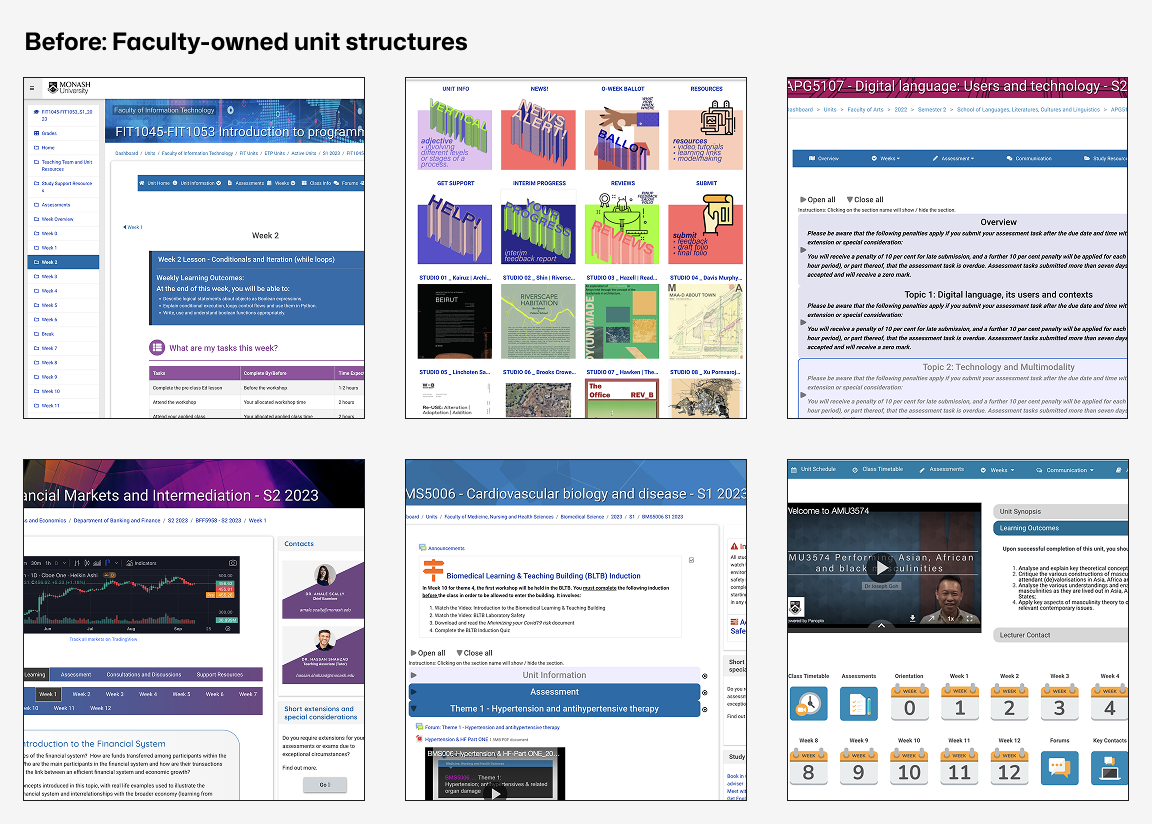 Monash’s Moodle environment evolved faculty by faculty. Each area owned its own unit layouts, navigation patterns, and terminology.