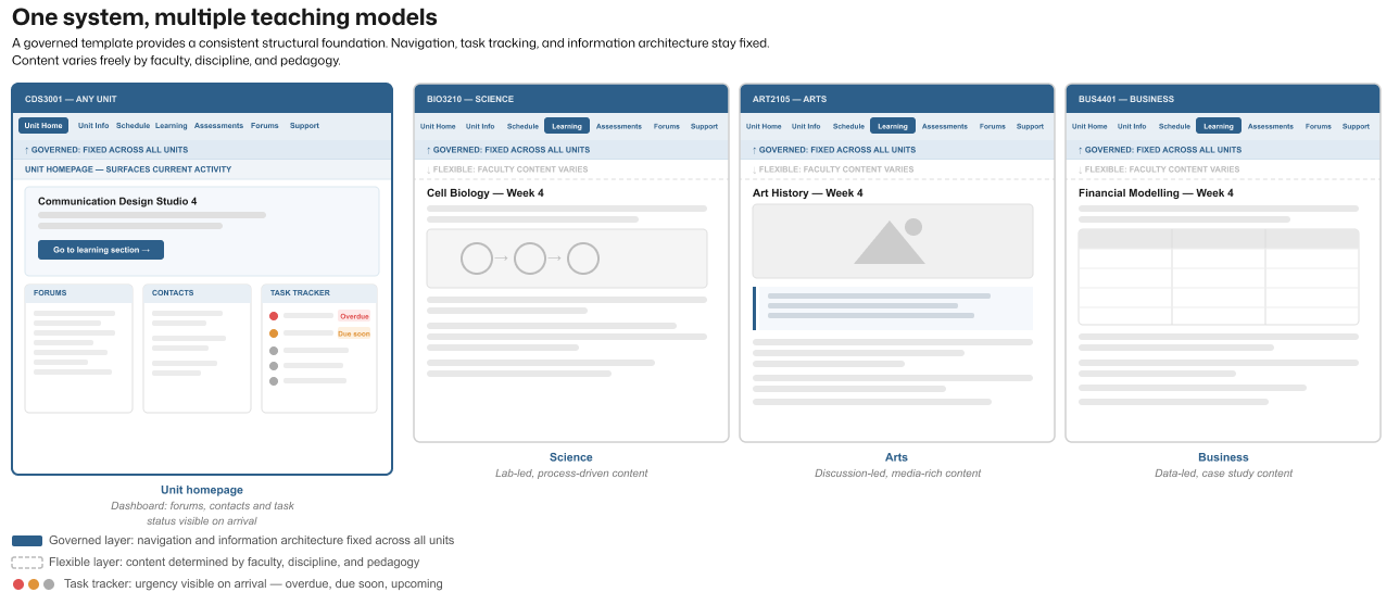 Over time, this created wide structural variation across units. Students moving between subjects encountered different ways of finding learning materials, assessments, and progress indicators. Teaching staff rebuilt structures manually, with no shared baseline to guide consistency.