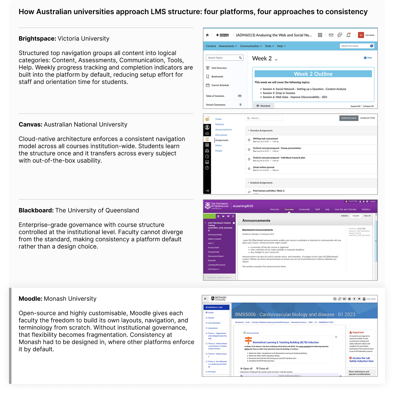 To build my own understanding of the problem space, I independently reviewed units across faculties, capturing screenshots to document structural variation firsthand. I also reviewed LMS platforms in use at other Australian universities, such as Victoria University and The Australian National University, synthesising findings into a structured comparison to identify what a governed Monash system needed to achieve.