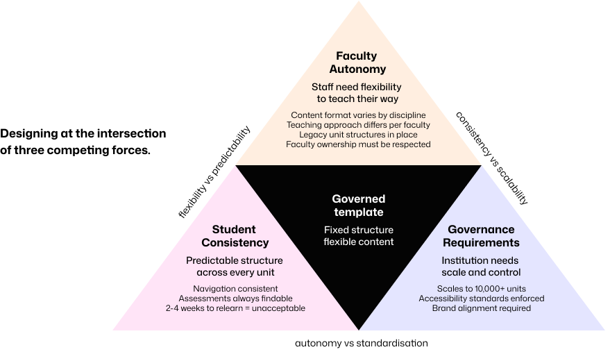 Moodle is open-source and highly customisable. Unlike Canvas, which is cloud-based with a consistent default structure enforced across all institutions, Moodle gives every faculty the ability to build their own layouts, navigation patterns, and terminology from scratch. At peer institutions that had adopted Canvas or Blackboard, structural consistency came largely by default. At Monash, on Moodle, it had to be designed deliberately through governance.