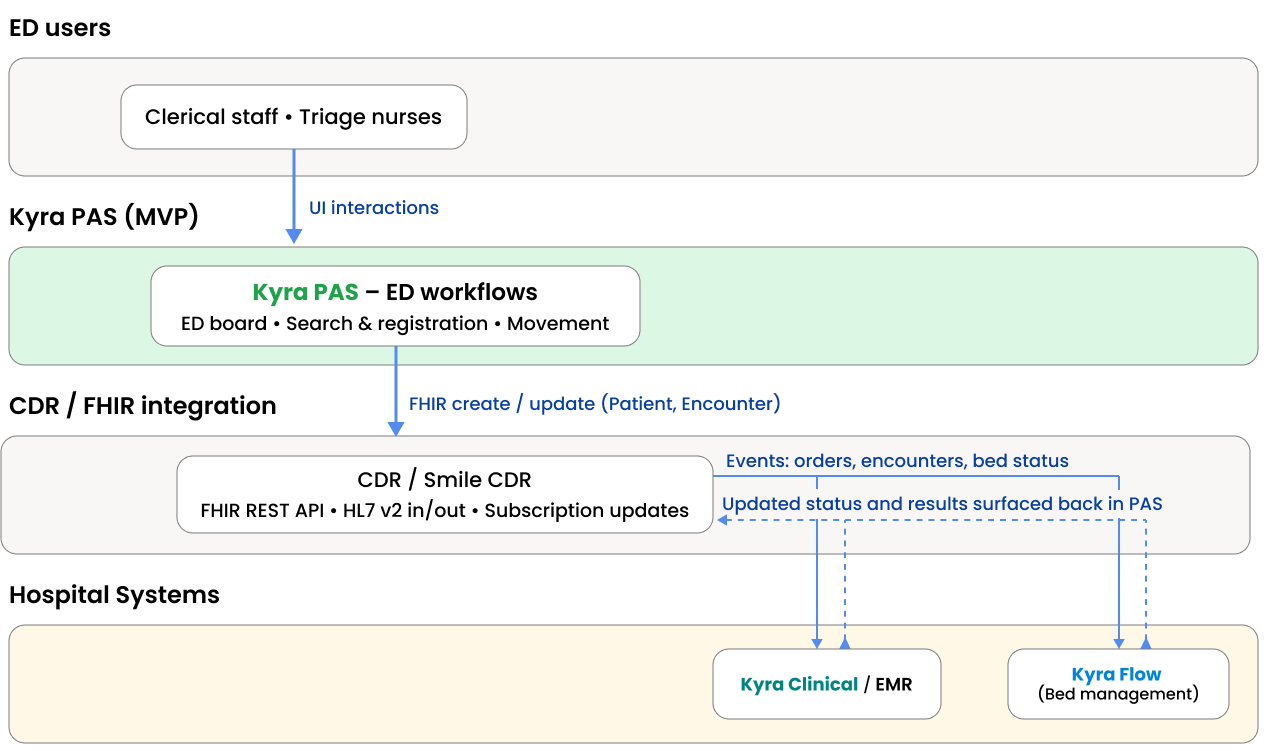 ED users → Kyra PAS (ED workflows and screens) → FHIR via CDR → EMR and Bed Management → back to ED via updated status.