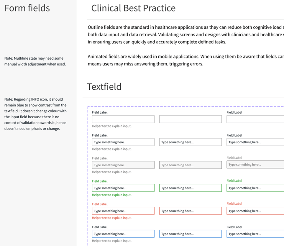Component library examples showing buttons and form fields with alternate status states and consistent icon usage for healthcare workflows.