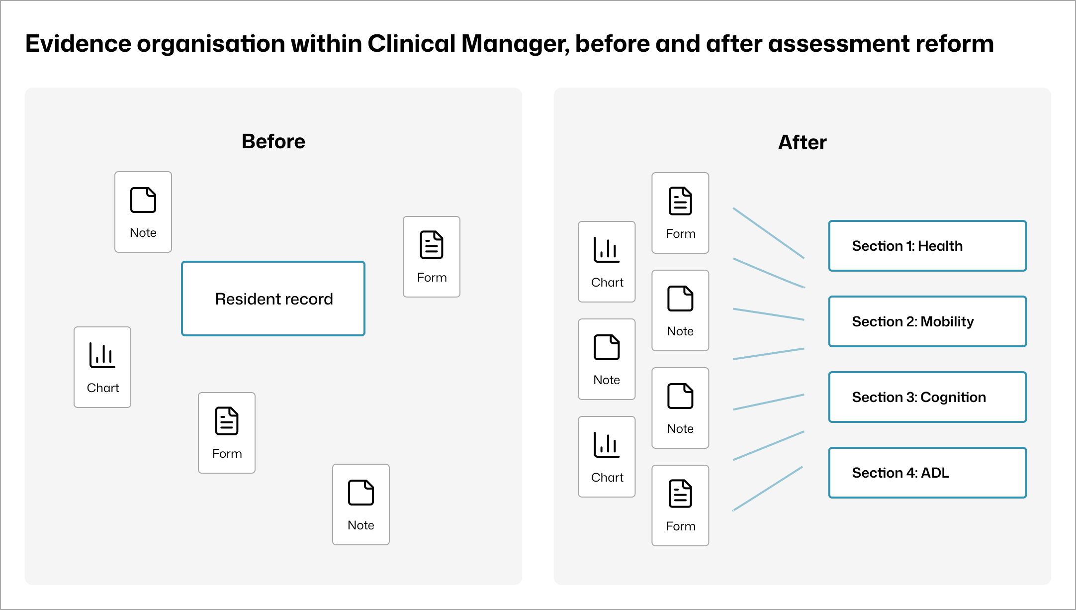 Visual 6 - Section-linked evidence within the resident record Evidence remains in the resident record and is explicitly linked to assessment sections, making coverage visible without duplicating documentation.