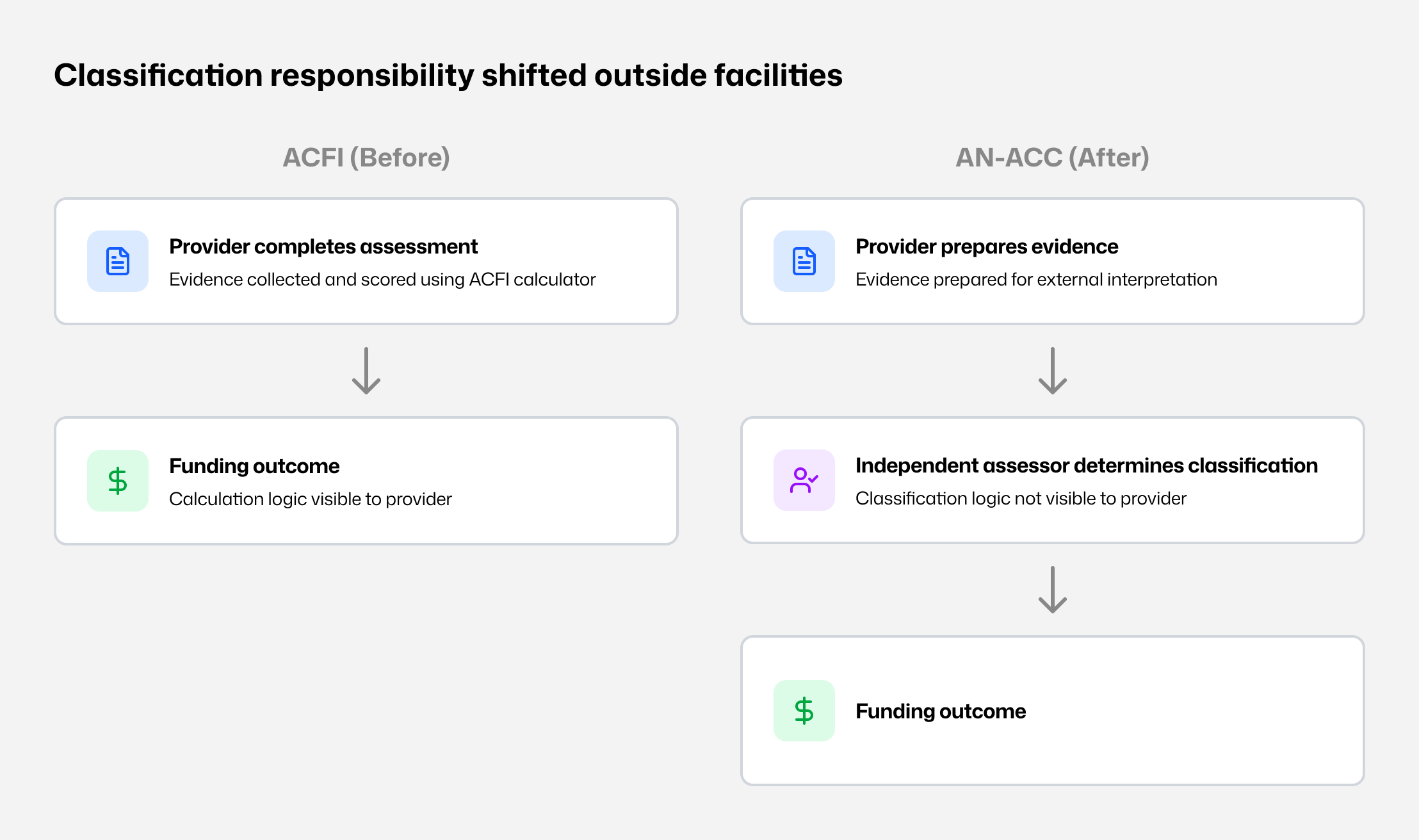 Visual 1 - Assessment authority shift Assessment moved from provider-led scoring to external classification under AN-ACC.