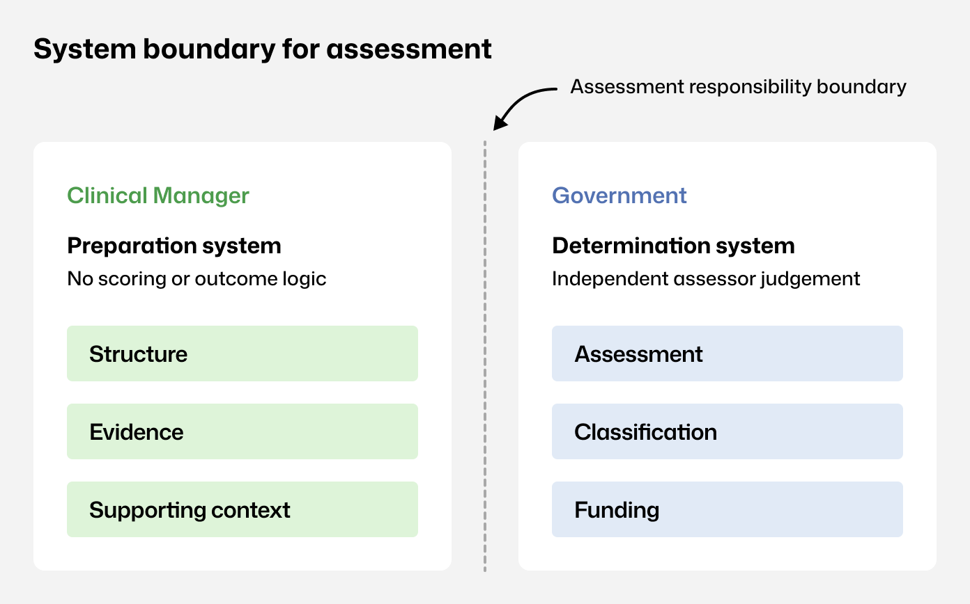 Visual 3 - Assessment responsibility boundary Clinical Manager supports preparation; assessment, classification, and funding sit with government assessors.