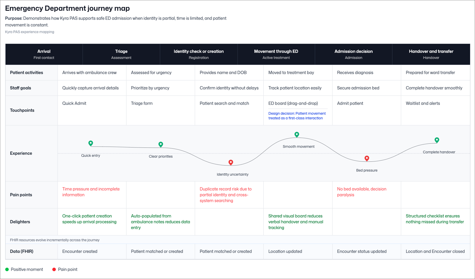 Visual 4 - Service design blueprint. Shows how ED staff, Kyra PAS, the FHIR Clinical Data Repository, EMR, bed management, and downstream services coordinate during Emergency Department admission.